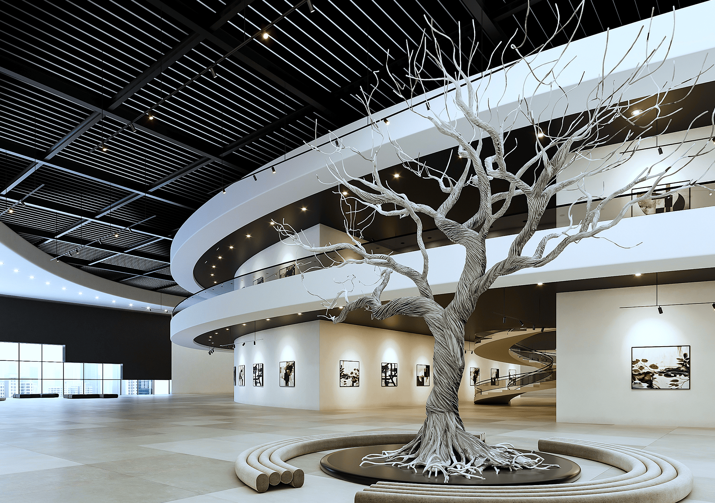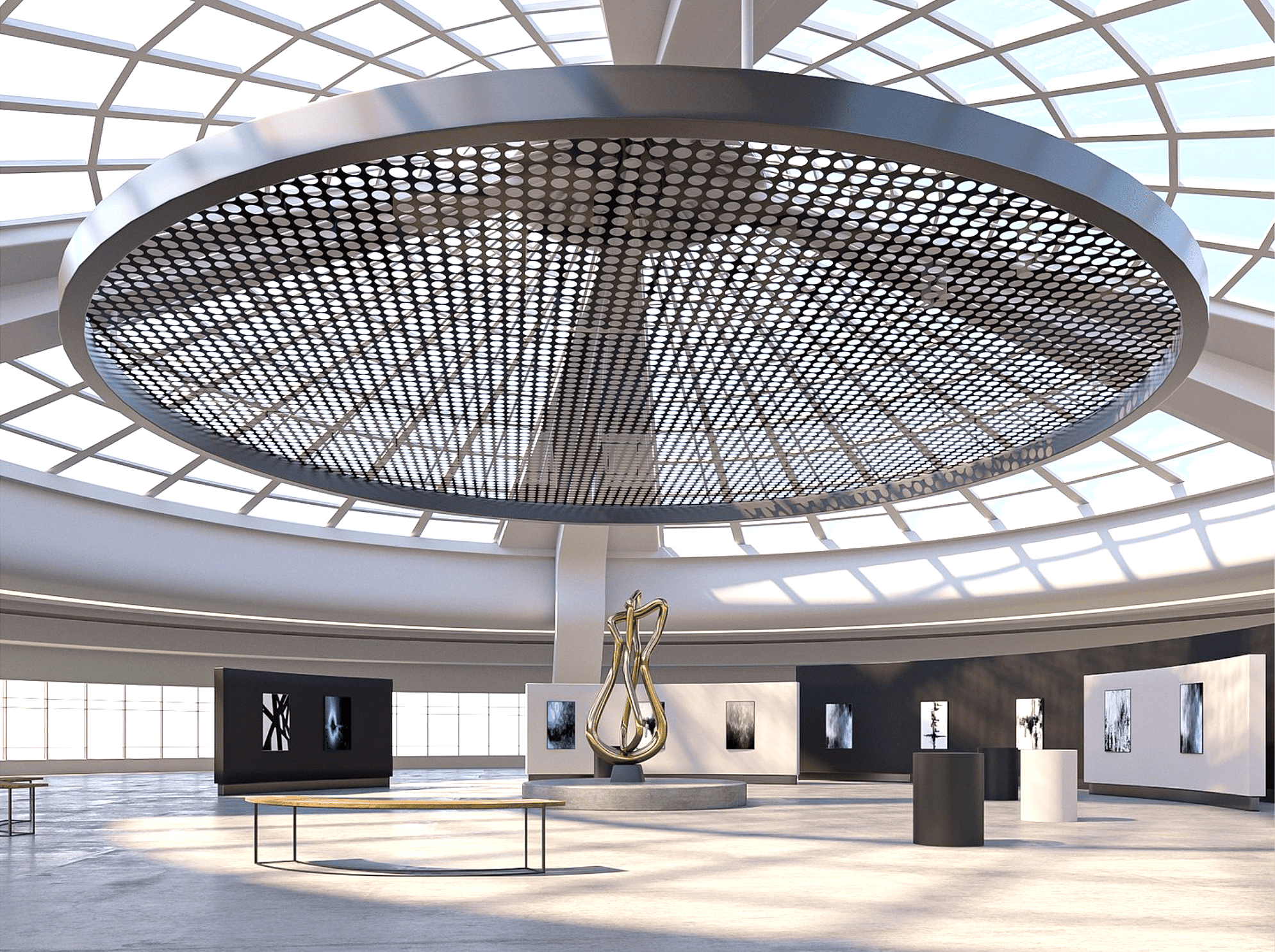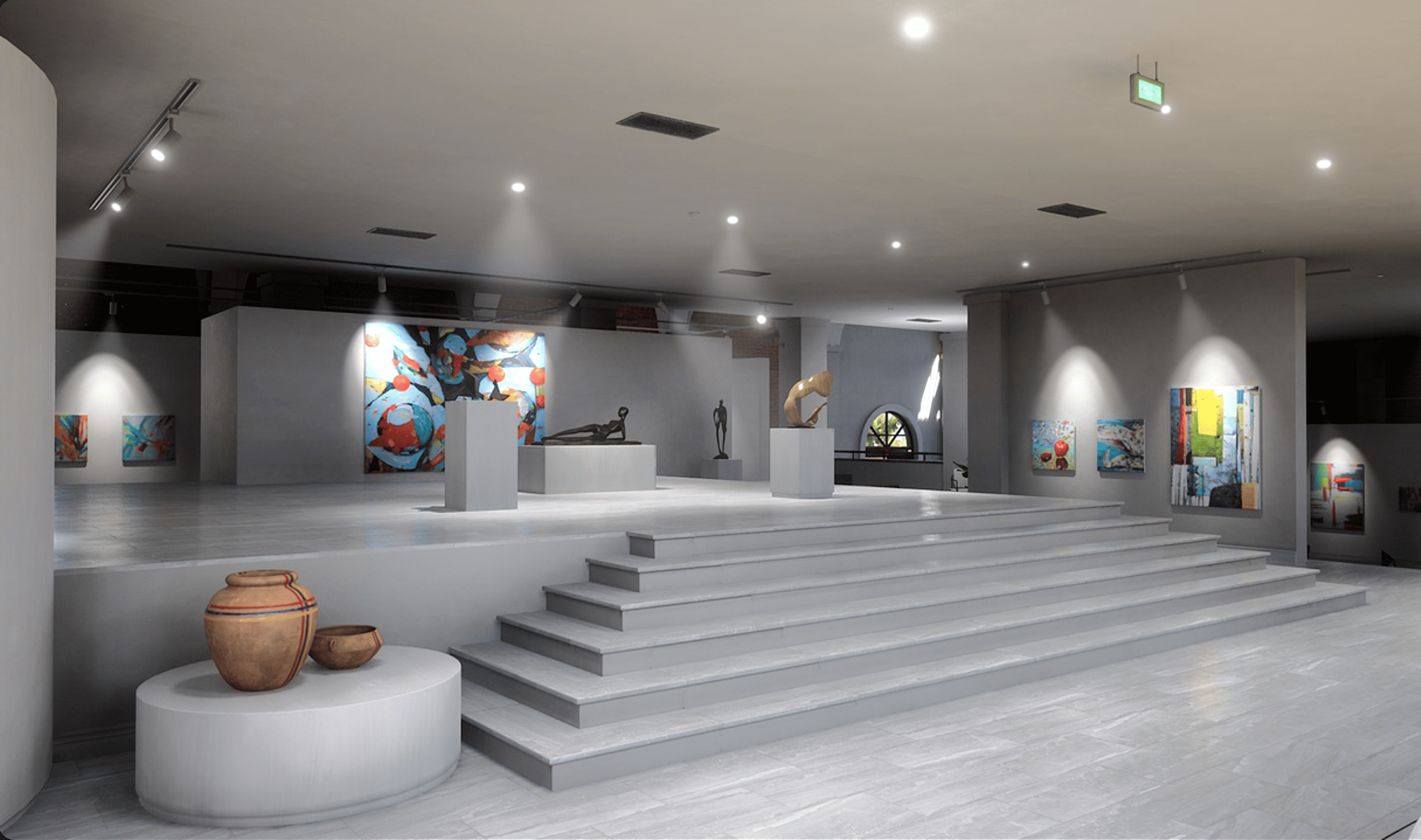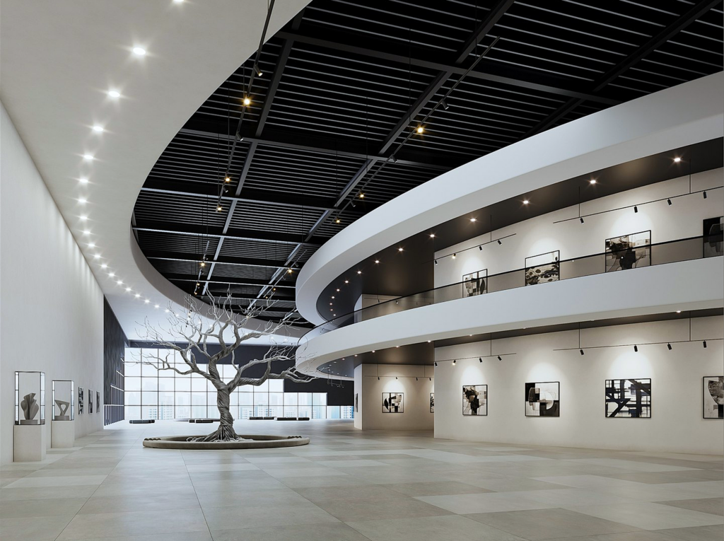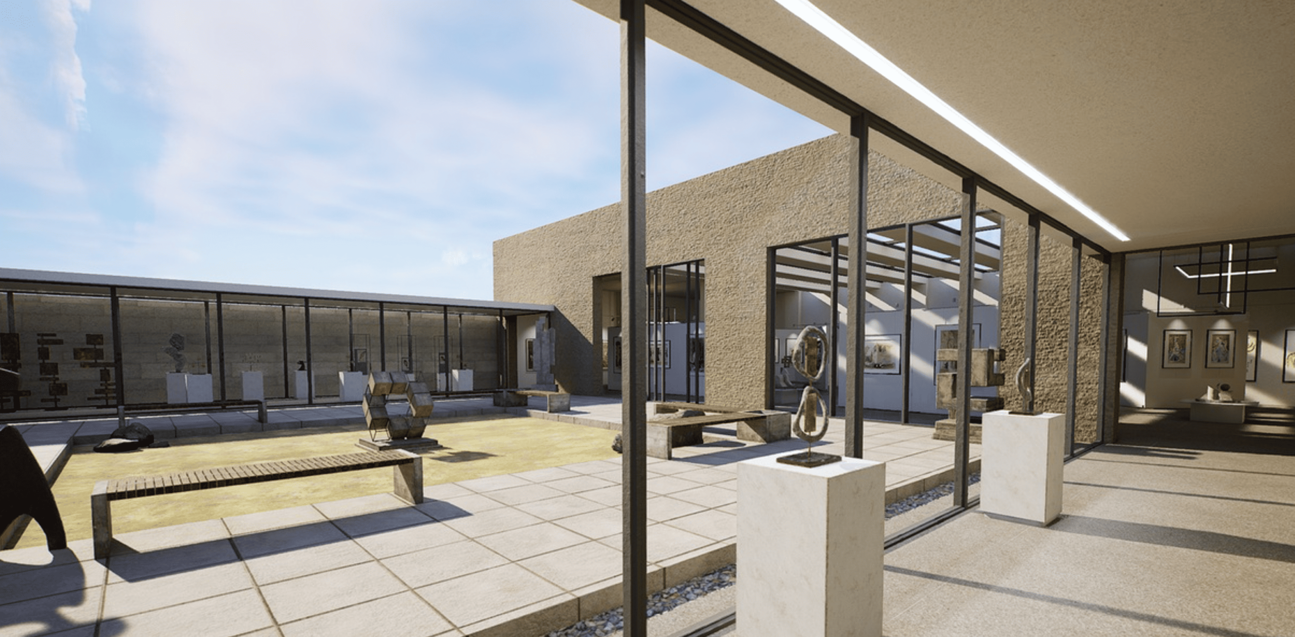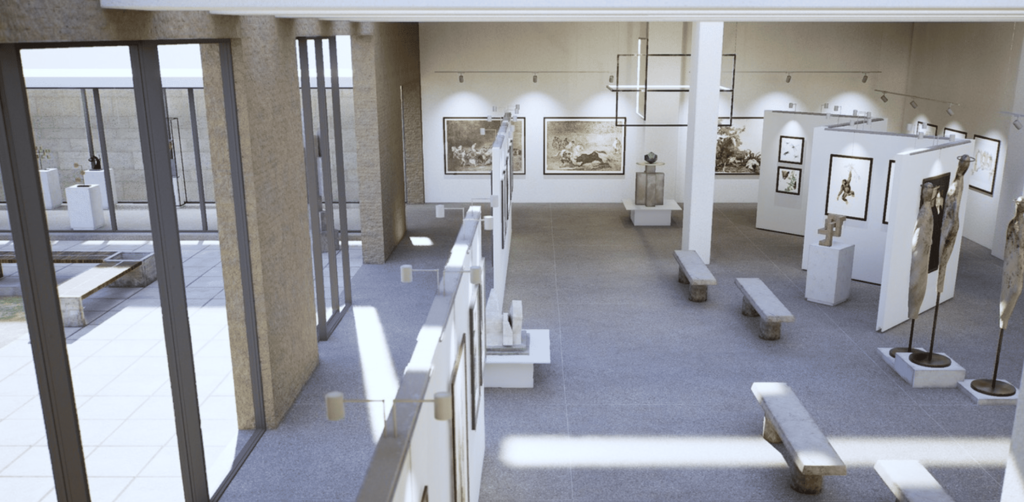 Con espacios exteriores e iluminación natural, esta galería virtual permite la exhibición de grandes piezas escultóricas.